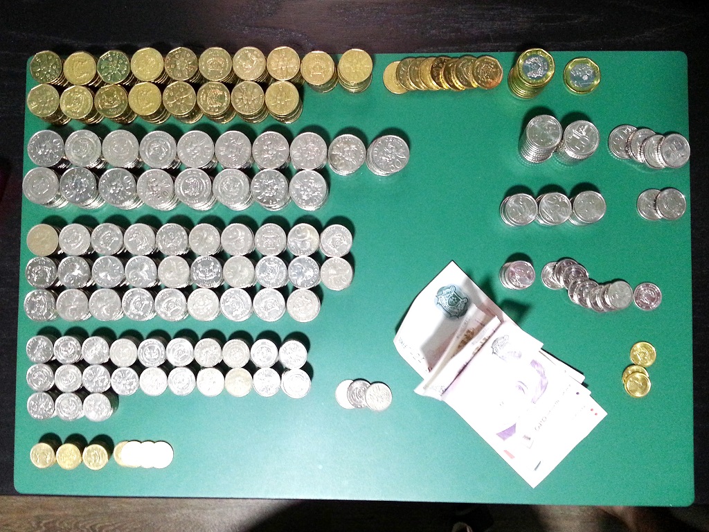 Low and behold, a mountain of coins on top of my green A3-sized cutting board!