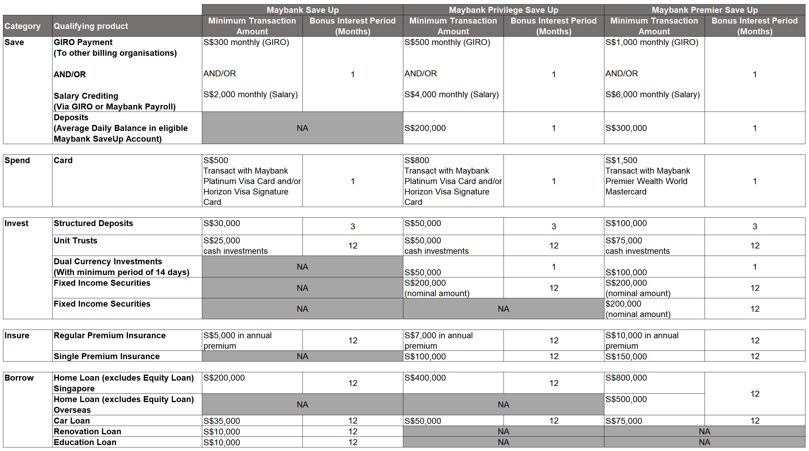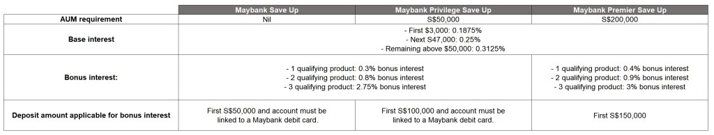 There are three tiers of Maybank Save Up programme which corresponds to the banking relationship tier. If you have S$200,000 of AUM with Maybank, you will be at the Maybank Premier segment which offers you both a slightly higher bonus interest rates and larger deposit amount applicable for bonus interest