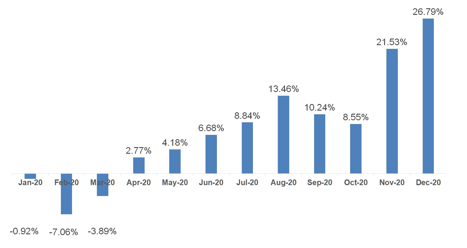 Fig 1. IWDA + EIMI + ES3 portfolio P&L as a percentage of invested capital at the end of each month in 2020