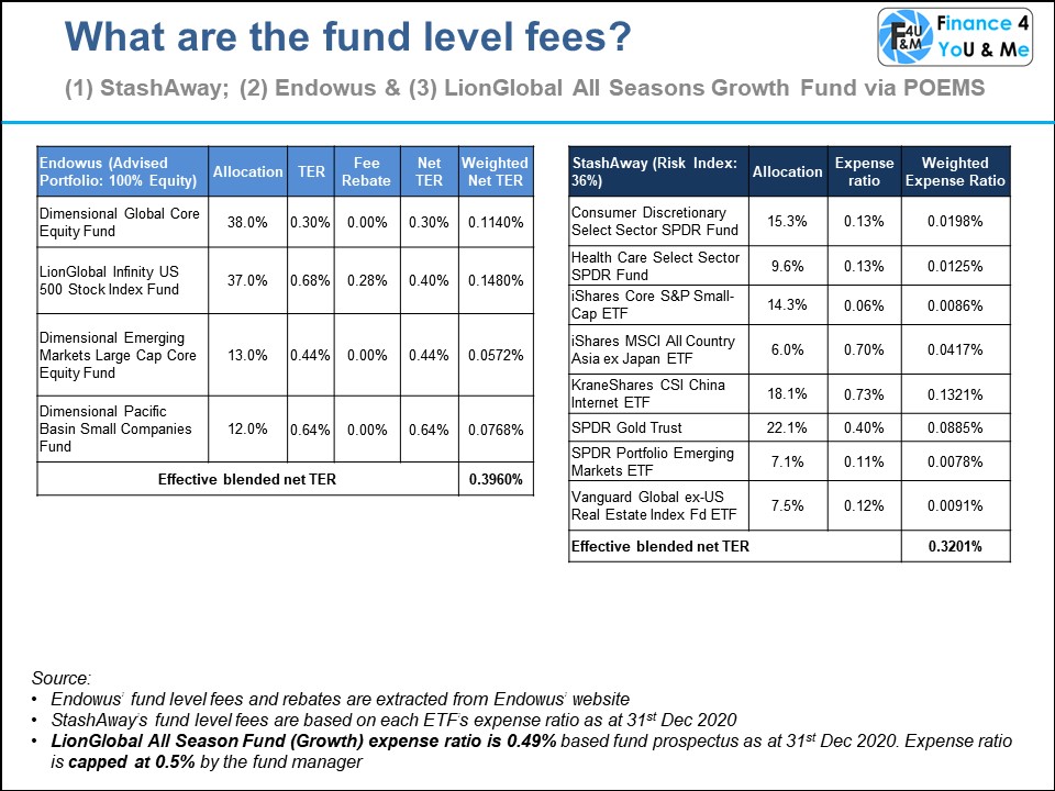 Referring to Fig 2, I have calculated the effective blended fund levels fees for the robo-investors based on the weightage and expense ratio of each fund.