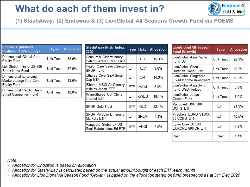 I have always wanted to try robo-investors or robo-advisors. After calculating the total costs, my personal conclusion was that I will not use cash to invest with Robo-investors. Instead, it makes a lot of sense to use robo-investors to invest with SRS because the commision cost is cheaper (compared to the local brokerage cost) and there are options for global market exposure. As shown in Fig 1, you can clearly see that each of them provides a very global market coverage. In the current market, there are only two robo-investors, Endowus and StashAway, which allow for investment using SRS monies.