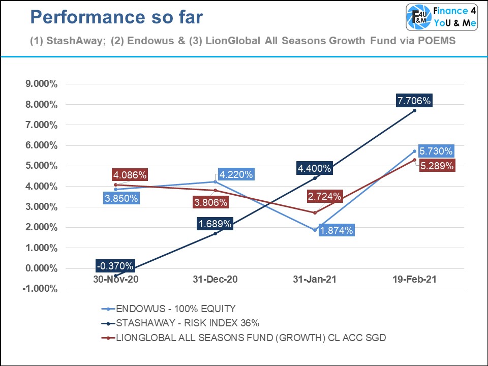 I decided to invest my SRS monies in three types of investments to meet my investment objectives. They are namely Endowus (Advised Portfolio: 100% Equity), StashAway (Risk Index: 36%) and LionGlobal All Season Fund (Growth).