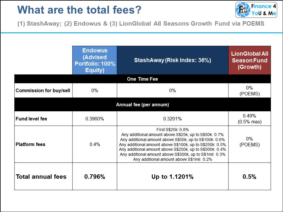 The total fees that will be incurred for these three investments with SRS monies are tabulated in Fig 3. There are no one-off buy/sell fees for all of them. However, Stashaway’s total fees is the highest amongst the three, at up to 1.1201% which is mainly due to the higher platform fees. This is followed by Endowus at 0.796% per annum. Cheapest is LionGlobal All Seasons Fund (Growth) as POEMS does not change a platform fee and LionGlobal, the fund manager, caps its expense ratio at 0.5%.